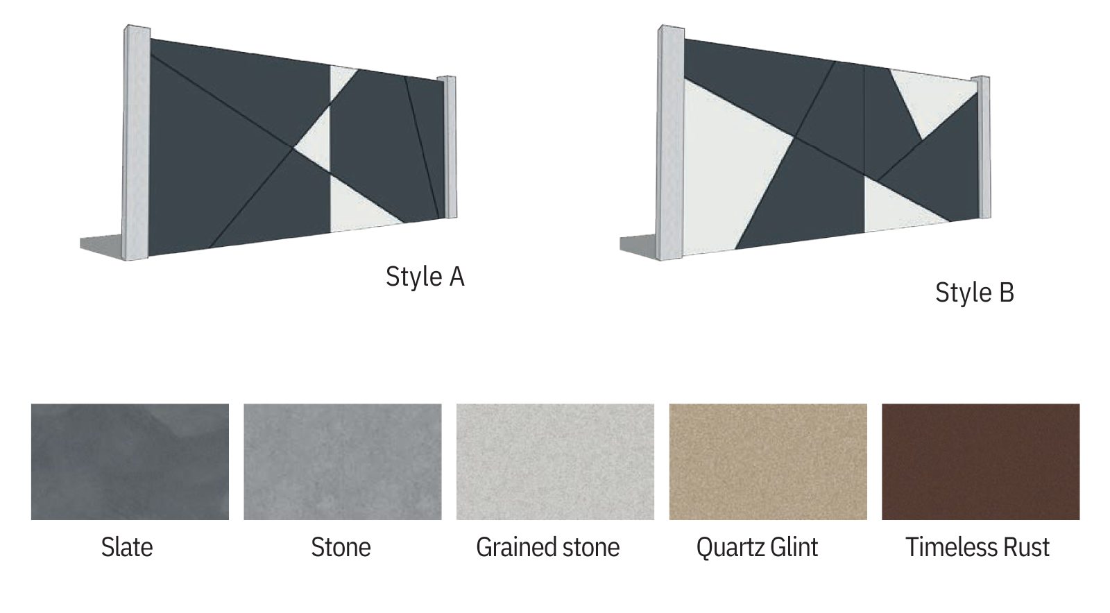 Aluminium panels covering the gate frame are crafted into geometric designs with the added option of bi-colouring, from our colour chart or with the colour options below.